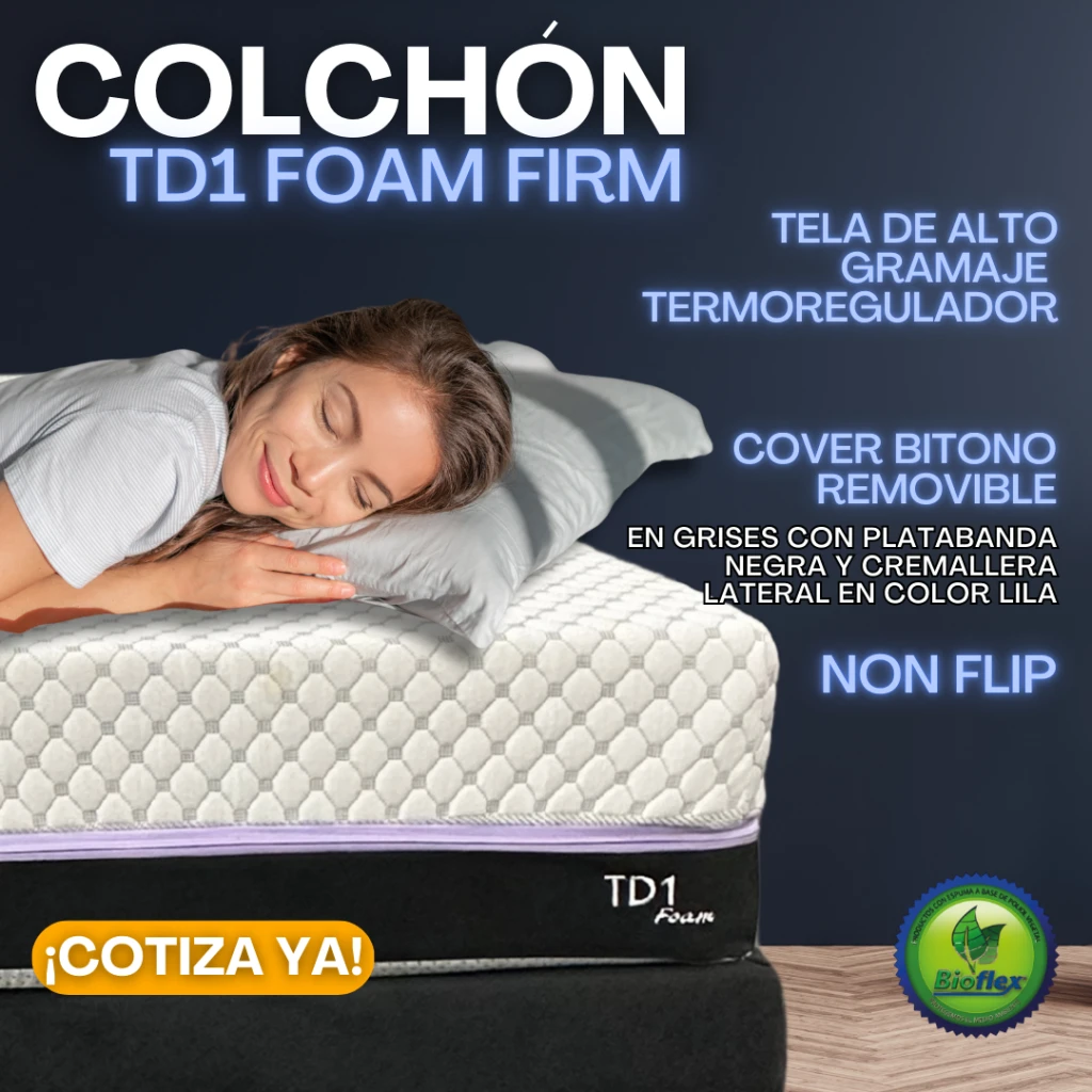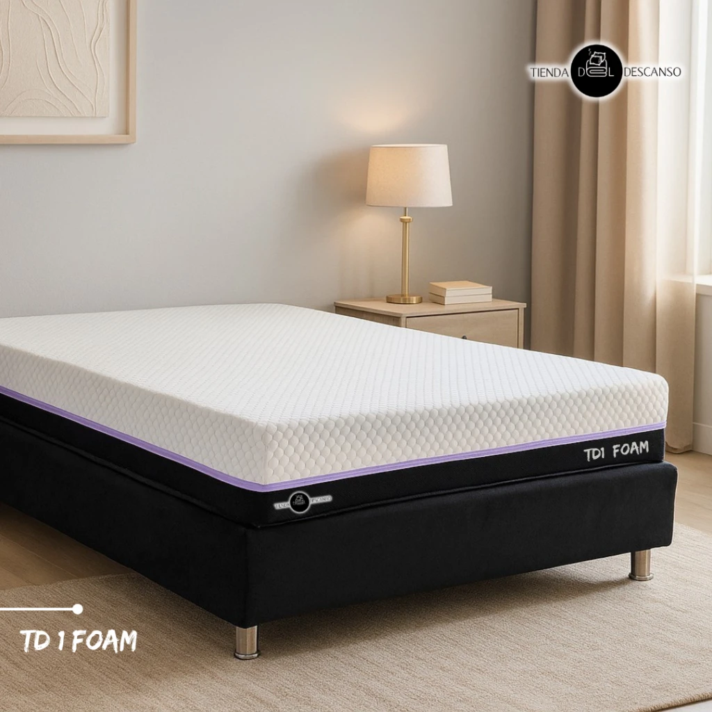 El Colchón TD1 Foam está diseñado para ofrecer un descanso firme, estable y duradero, ideal para quienes prefieren firmeza alta, ya sea por costumbre o por prescripción médica, especialmente en casos de dolores de columna o zona lumbar. Su soporte zonificado en 5 áreas, desarrollado con espuma de alta densidad, favorece una correcta alineación corporal y ayuda a reducir molestias durante el descanso.