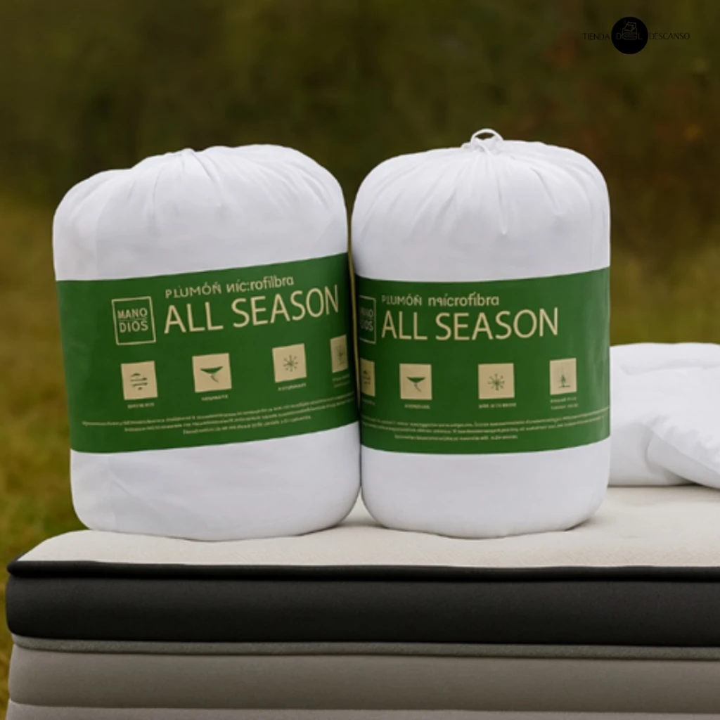 El plumón All season marca la diferencia gracias a su llenado que guarda de forma independiente la fibra en cada recuadro; le da una propiedad más suave y liviana, proporcionando un mejor vestido para su cama al permitir una mejor caída. Es especial para cualquier tipo de clima o región manteniendo una temperatura agradable.