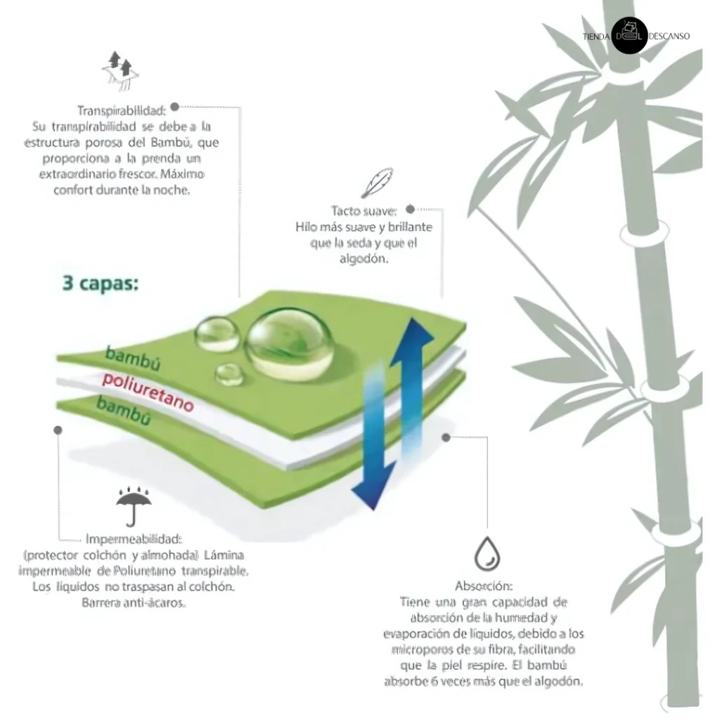 El Protector de Colchón Bambú Riso proporciona suavidad y frescor natural, ya que es más absorbente y suave que el algodón, tiene una gran capacidad de absorción de la humedad con alto grado de transpirabilidad debido a los microporos de su fibra, con membrana interna de poliuretano 100% impermeable evitando que los accidentes lleguen al colchón.