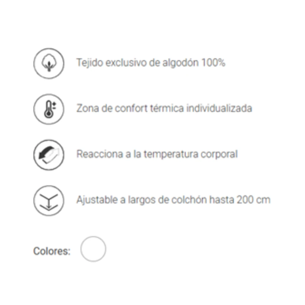 La sábana bajera Termo-reguladora de Velfont está confeccionada con tejido termo-regulador 100% algodón, que aplica la más avanzada tecnología desarrollada por la NASA con el tejido de algodón, obteniendo un producto exclusivo y único en el mercado. El tejido termo-regulador actúa absorbiendo, almacenando y liberando el calor que nuestro cuerpo desprende, creando una zona individualizada de confort. Proporciona un microclima constante, ni demasiado frío, ni demasiado calor.